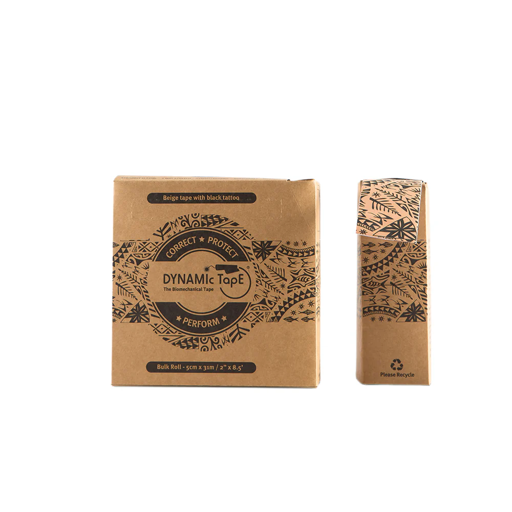 Dynamic Tape Beige with Black Tattoo is a biomechanical tape that is designed to provide very strong resistance and recoil to manage load and alter movement patterns, much like an external muscle. The tape provides a deceleration force, absorbs load and reduces the work on injured, overloaded or fatigued tissues.